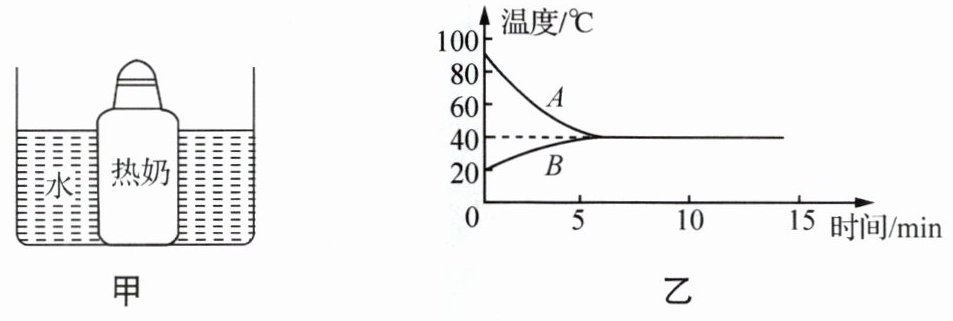 15 将装有热奶的奶瓶放入水中冷却,如图甲所示;根据测得的数据,作出热奶和水的温度随时间变化的图像,如图乙所示.根据图像回答下列问题:
