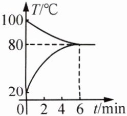 13(2024无锡新吴期末)将一个温度为$20\ {\hspace{0pt}}^{\circ }\text{C}$、质量为500 g的物块放入温度为$100\ {\hspace{0pt}}^{\circ }\text{C}$、质量为1000 g的水中[水的比热容为$4.2× 10^{3}\ \text{J/(kg·}{\hspace{0pt}}^{\circ }\text{C})$],物块和水的温度随时间的变化图像如图所示(不计热损失)。以下说法正确的是 (