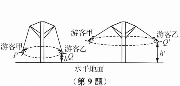 9 新情境(2025宿迁沭阳模拟)如图所示为游乐场中旋转飞椅的示意图。飞椅和游客的运动速度越大,他们会被“甩”得越高。游客乙从图中的位置Q变化到位置$Q'$的过程,他的动能