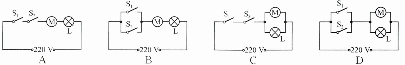 7 (2024 镇江)某学校电动门既可以用遥控器开启,也可以用按钮开关开启. 电动门开启时,电动机工作,警示灯L亮起. 若取下警示灯L,电动机仍能工作,按下遥控器相当于$S_1$闭合,按下按钮开关相当于$S_2$闭合,符合上述要求的电路是 (