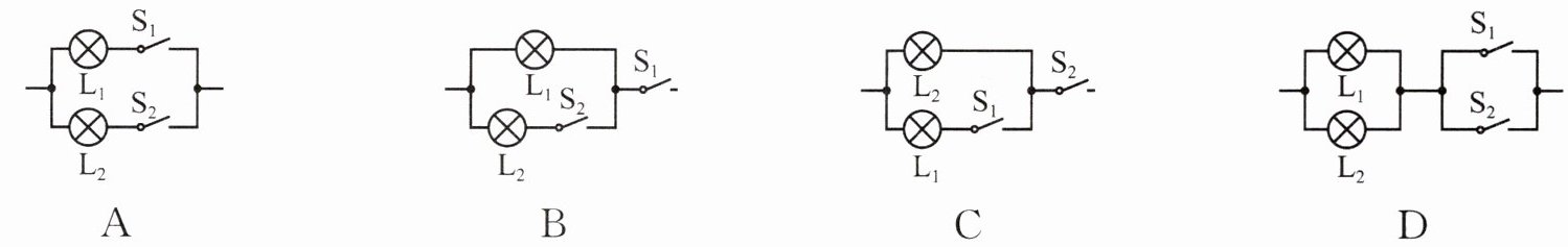 8 易错题 (2023 安徽)老师给小龙一个密封盒,其表面可见两个开关$S_1、$$S_2$和两盏灯$L_1、$$L_2. $为了探究开关和灯在密封盒内是如何连接的,小龙进行了如下操作:先闭合$S_1,$只有灯$L_1$发光;又闭合$S_2,$两灯都发光;再断开$S_1,$两灯都熄灭. 符合上述实验结果的连接方式为 (