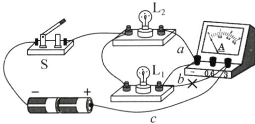 (3)请在图甲中只改动一根导线,使电流表测通过灯$L_{1}和L_{2}$的总电流.(要求:在需改动的导线上画“×”,用笔将改动后的导线画出,导线不许交叉)