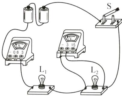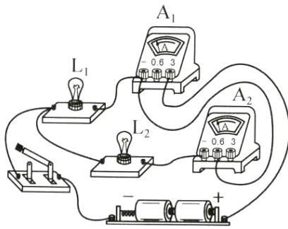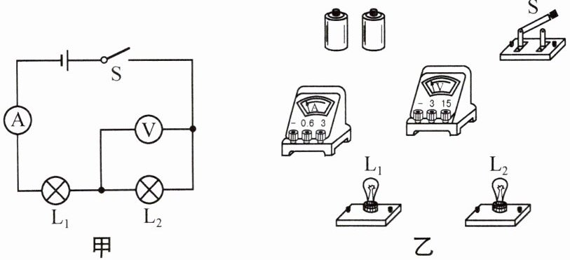 8 如图甲所示电路,闭合开关后,通过灯$L_1 $的电流为0.2 A,通过灯$L_2 $的电流为0.5 A.请在图乙所示的实物图上用笔画线代替导线将电路连接完整.(注意连线不能交叉)