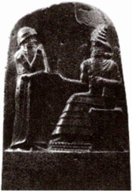 材料三 据说,汉谟拉比每天要处理的案件太多,难以应付。他就让臣下把过去的一些法律条文收集起来,再加上社会上已形成的习惯,编成一部法典,并将它刻在高 2.25 米的石柱上,竖立在巴比伦的神殿里。石柱上端的浮雕展现了汉谟拉比站在太阳和正义之神沙马什面前,接受象征王权的权标的场景。