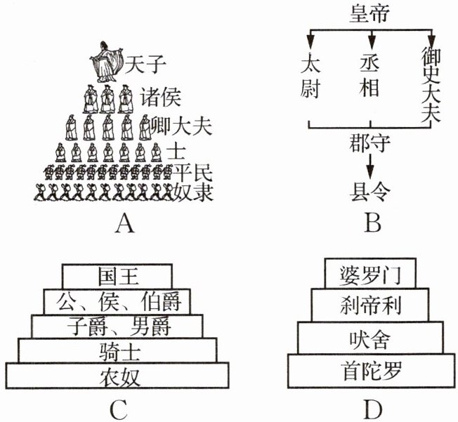 2. 下列示意图中能够反映古代印度种姓制度的是( )