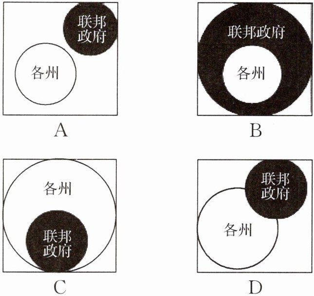 解:根据1787年美国宪法,美国实行联邦制,联邦政府拥有宪法明确赋予的权力,各州拥有保留的权力,两者权力范围不同且相互独立,不存在包含关系,部分权力可能有重叠。图D中联邦政府与州政府为两个独立且部分重叠的圆,符合联邦制下权力关系。