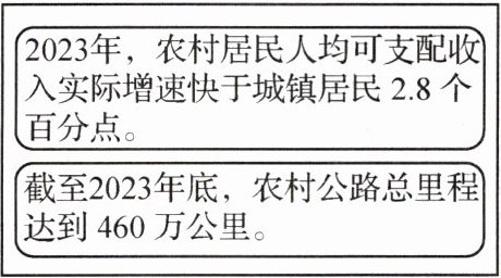 (1)这两幅图说明了2019—2023年我国城乡居民人均可支配收入逐年增加,但农村居民人均可支配收入低于城镇居民,城乡发展不平衡。2023年农村人均可支配收入实际增长速度快于城镇居民,基础设施逐步完善,说明了人民生活水平提高,乡村全面振兴成效显著,人民共享发展成果。