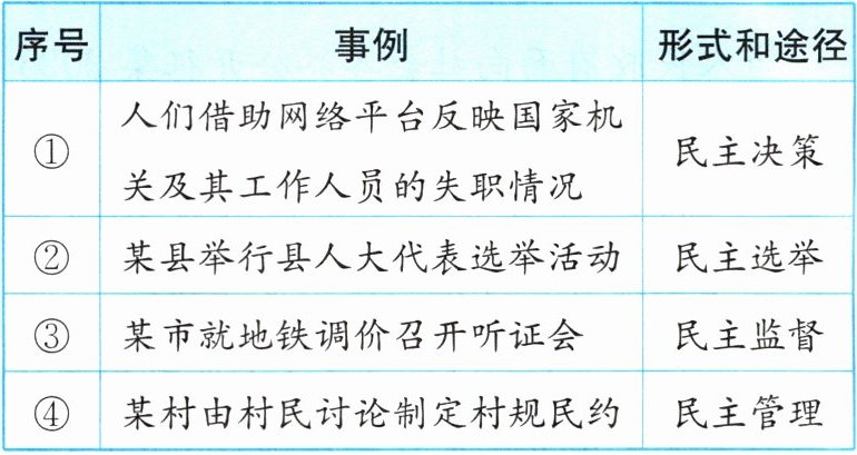 |①|人们借助网络平台反映国家机关及其工作人员的失职情况|民主决策|