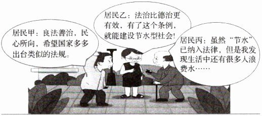 (1)①居民乙的观点是不正确的。②法律与道德相辅相成,法治与德治相得益彰。建设节水型社会,需要法律和道德共同发挥作用,既重视发挥法律的规范作用,又重视发挥道德的教化作用。③建设节水型社会不仅需要法律约束,还要对全体社会成员加强道德教育,促使全体社会成员自觉承担社会责任,增强节水意识。