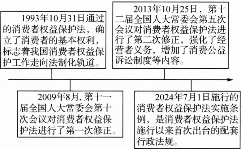 同学们围绕与实际生活相关的法治问题,整理出了我国消费者权益保护工作的发展历程,如下图所示:
