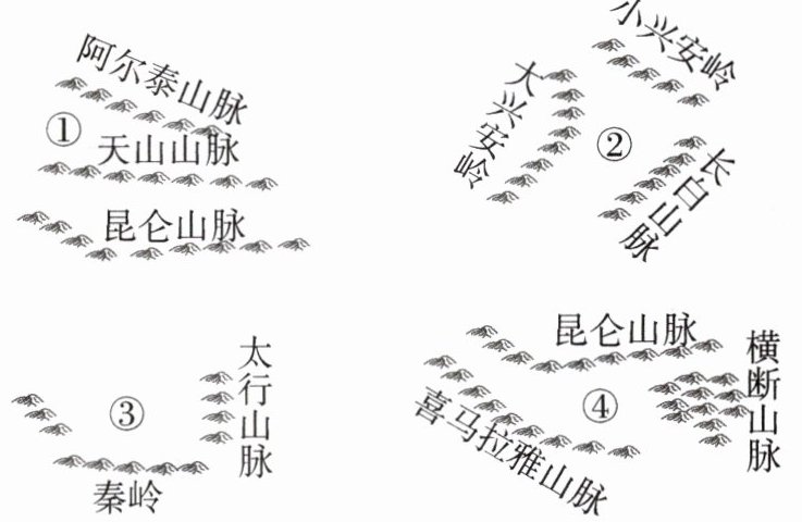 「2025山东滨州无棣期中」我国地域辽阔,五岳山川巍峨耸立,是祖国不屈的脊梁。下图示意“我国部分山脉分布”。据此完成4—6题。