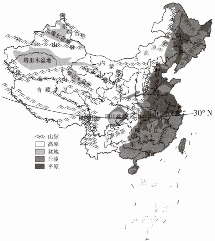 1.C 我国地形类型多种多样,五种基本地形类型都有分布。2.D 我国西部多有以青藏高原为代表的高原地形,以及天山、昆仑等山地地形和塔里木盆地等盆地地形。3.A 读图可知,沿着北纬30°纬线自东向西依次经过长江中下游平原、四川盆地、青藏高原。