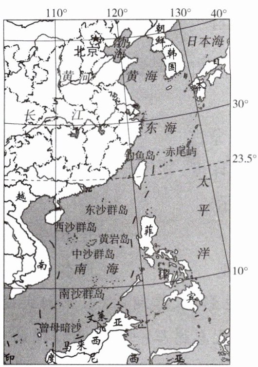 导向 教育 「2024北京通州期中」海洋国土是国土的重要组成部分。根据《联合国海洋法公约》,中国管辖海域面积广阔,拥有总长1.8万多千米的大陆海岸线,拥有大小岛屿1.1万多个。下图为我国局部地图。读图完成6—7题。