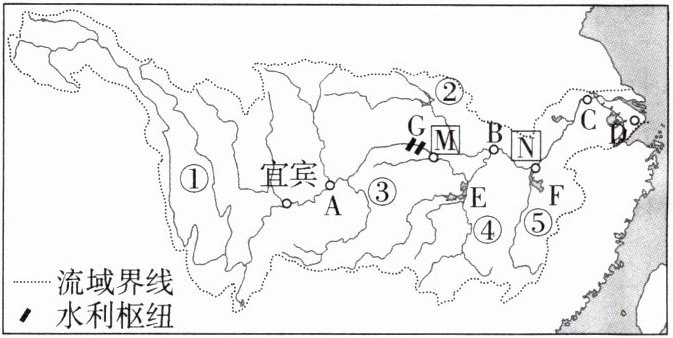 (1)①雅砻江 ②汉江 ③乌江 ④湘江 ⑤赣江(2)E 洞庭湖 F 鄱阳湖(3)宜昌 湖口(4)A 重庆 B 武汉 C 南京 D 上海(5)G 三峡