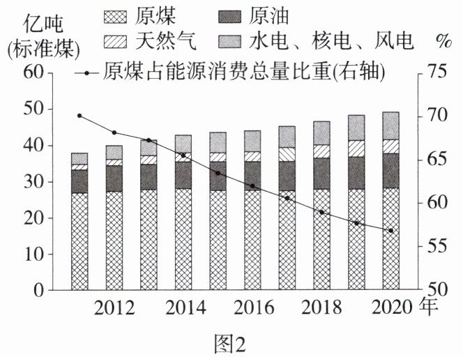 能源消费是指生产和生活所消耗的能源。某些能源消费(如煤、石油等)会污染大气,也会排放二氧化碳等温室气体。我国立足能源现状,稳妥推进碳达峰与碳中和目标,积极参与应对气候变化全球治理。图2为我国能源消费结构和原煤占能源消费总量比重统计图。