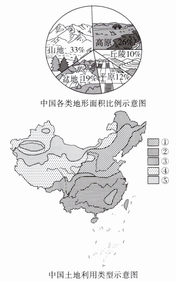 (2) 中国土地利用类型示意图中代表耕地的是______(填序号),序号③表示的土地利用类型是______。(4 分)