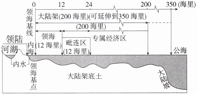 我国管辖的海域指管辖的内海、领海、毗连区、大陆架和专属经济区等海域,约 300 万平方千米。读“我国主张管辖的海域空间结构示意图”,完成下题。