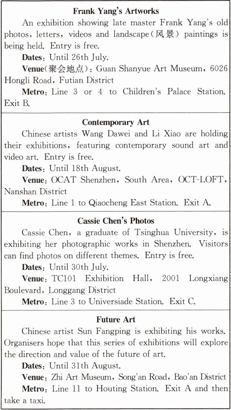 )3. Which exhibitions can you choose if you are free on 15th August?A. Contemporary Art and Future Art.