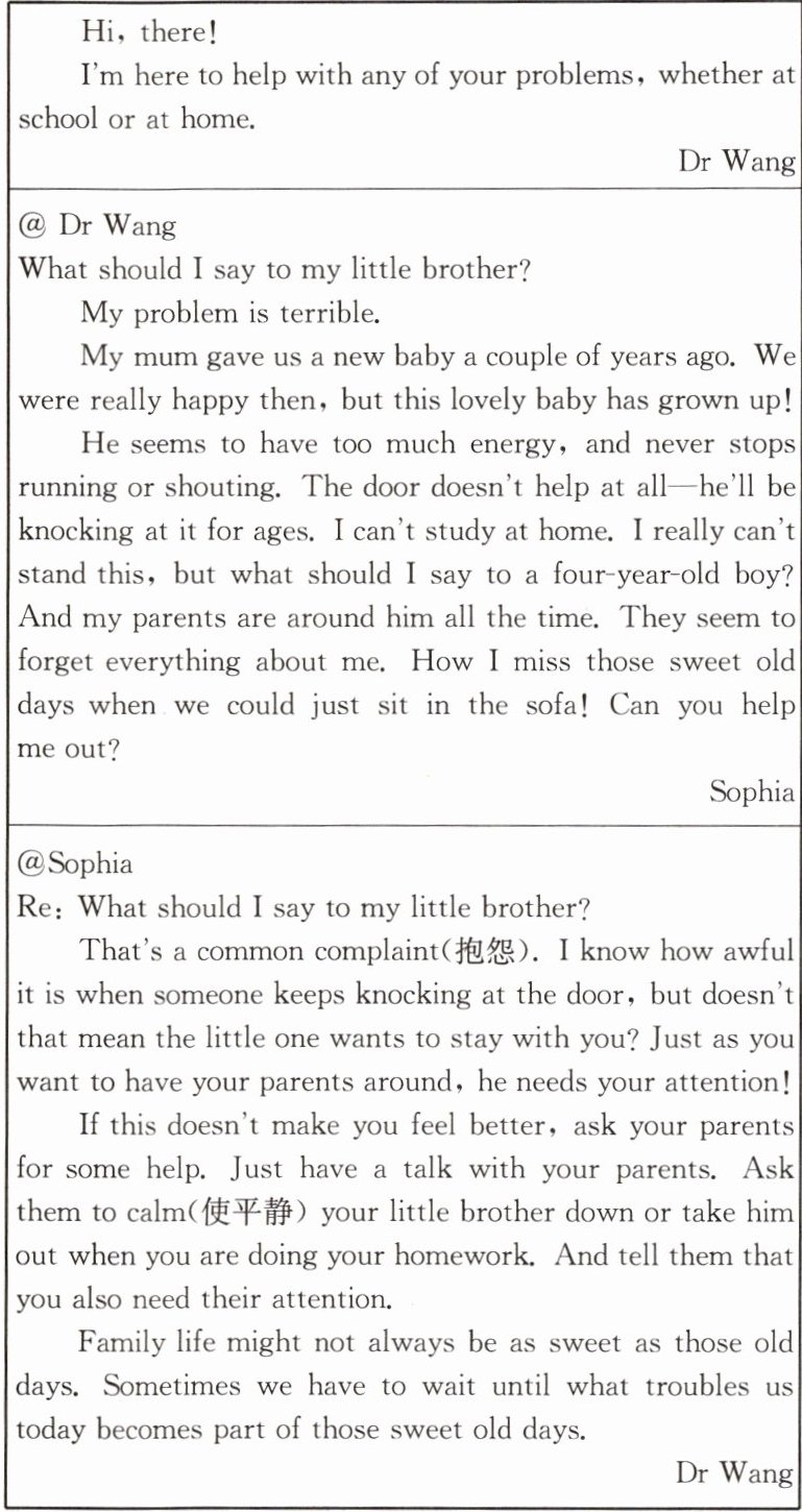 1. Was Sophia happy to have a little brother at first? (不超过 10 个词)