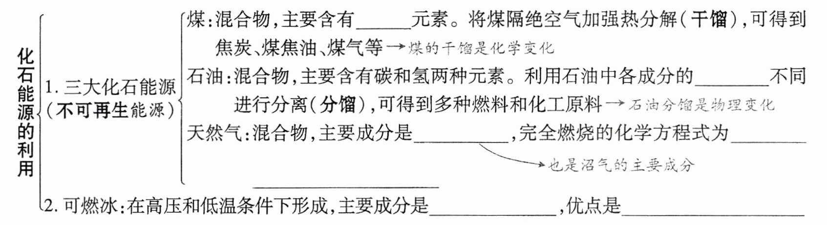 1.碳 沸点 甲烷(或 CH₄) CH₄+2O₂$\frac{\underline{\;点燃\;}}{\;}$CO₂+2H₂O 2.甲烷水合物 热值高、储量巨大