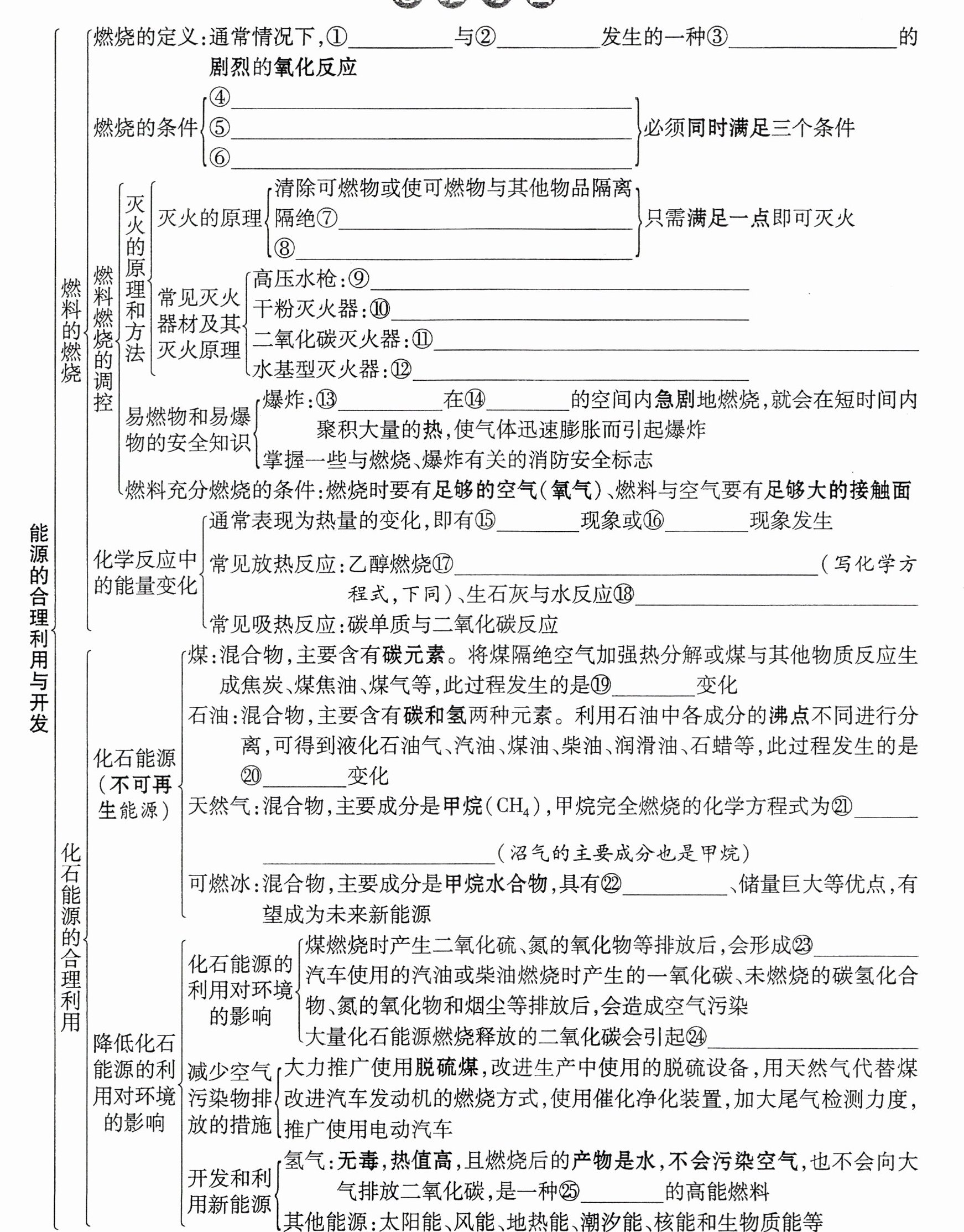 ①可燃物 ②氧气 ③发光、放热 ④可燃物 ⑤氧气(或空气) ⑥达到燃烧所需的最低温度(着火点) ⑦氧气(或空气) ⑧使温度降到着火点以下 ⑨降低温度到可燃物的着火点以下 ⑩隔绝氧气(或空气) ⑪隔绝氧气(或空气)、降低温度到可燃物的着火点以下 ⑫隔绝氧气(或空气) ⑬易燃物 ⑭有限 ⑮放热 ⑯吸热 ⑰${C2H5OH + 3O2 \xlongequal{点燃} 2CO2 + 3H2O}$ ⑱${CaO + H2O \xlongequal{} Ca(OH)2}$ ⑲化学 ⑳物理 ㉑${CH4 + 2O2 \xlongequal{点燃} CO2 + 2H2O}$ ㉒热值高 ㉓酸雨 ㉔温室效应加剧 ㉕清洁