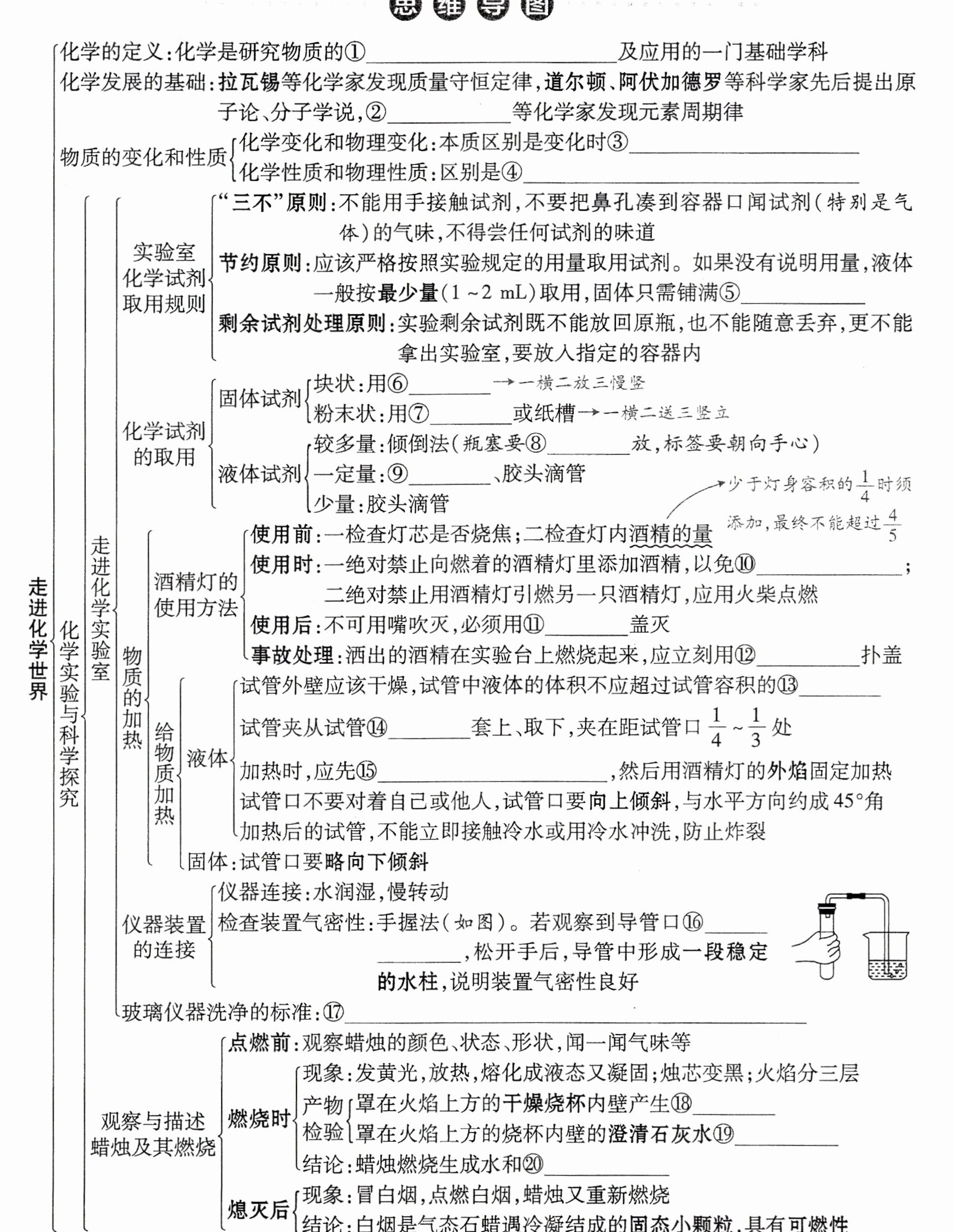 ①组成、结构、性质、转化 ②门捷列夫 ③是否有新物质生成 ④是否需要通过化学变化表现出来 ⑤试管底部 ⑥镊子 ⑦药匙 ⑧倒 ⑨量筒 ⑩失火 ⑪灯帽 ⑫湿抹布 ⑬$\frac{1}{3}$ ⑭底部 ⑮使试管底部均匀受热 ⑯有气泡冒出 ⑰仪器内壁附着的水既不聚成水滴,也不成股流下 ⑱水雾 ⑲变浑浊 ⑳二氧化碳