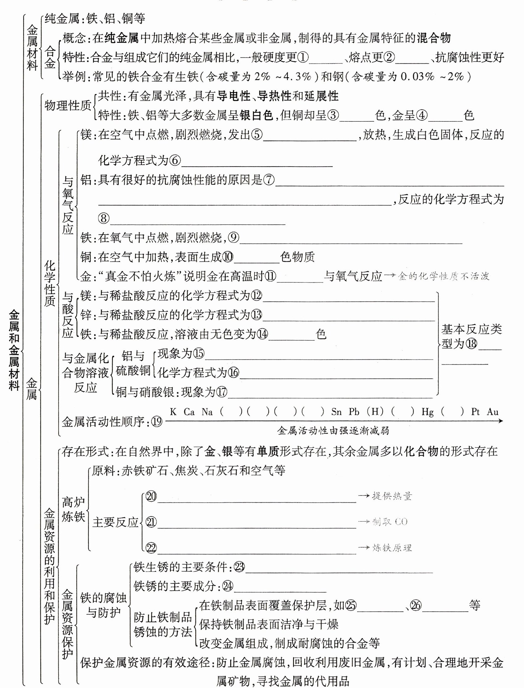 ①大 ②低 ③红 ④黄 ⑤耀眼的白光 ⑥2Mg+O₂点燃2MgO ⑦铝在空气中与氧气反应,其表面生成一层致密的氧化铝(Al₂O₃)薄膜,从而阻止铝进一步被氧化 ⑧4Al+3O₂=2Al₂O₃ ⑨火星四射,放出大量的热,生成黑色固体 ⑩黑 ⑪不能 ⑫Mg+2HCl=MgCl₂+H₂↑ ⑬Zn+2HCl=ZnCl₂+H₂↑ ⑭浅绿 ⑮有红色固体析出,溶液由蓝色变为无色 ⑯2Al+3CuSO₄=Al₂(SO₄)₃+3Cu ⑰有银白色固体析出,溶液由无色变为蓝色 ⑱置换反应 ⑲Mg Al Zn Fe Cu Ag ⑳C+O₂高温CO₂ ㉑CO₂+C高温2CO ㉒3CO+Fe₂O₃高温2Fe+3CO₂ ㉓与空气和水(或水蒸气)直接接触 ㉔Fe₂O₃·xH₂O(或Fe₂O₃) ㉕涂油 ㉖刷漆