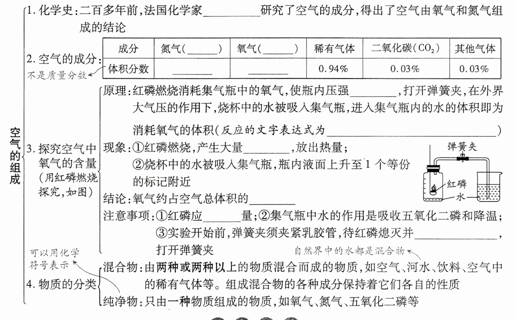 1.拉瓦锡 2.N₂ O₂ 78% 21% 3.减小 红磷+氧气$\xrightarrow{点燃}$五氧化二磷 白烟 $\frac{1}{5}$ 足 冷却至室温