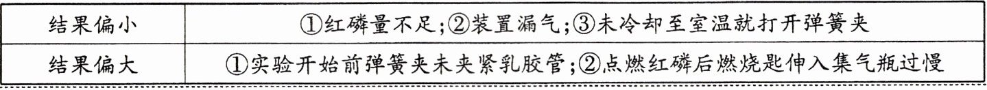 |结果偏小|①红磷量不足;②装置漏气;③未冷却至室温就打开弹簧夹|