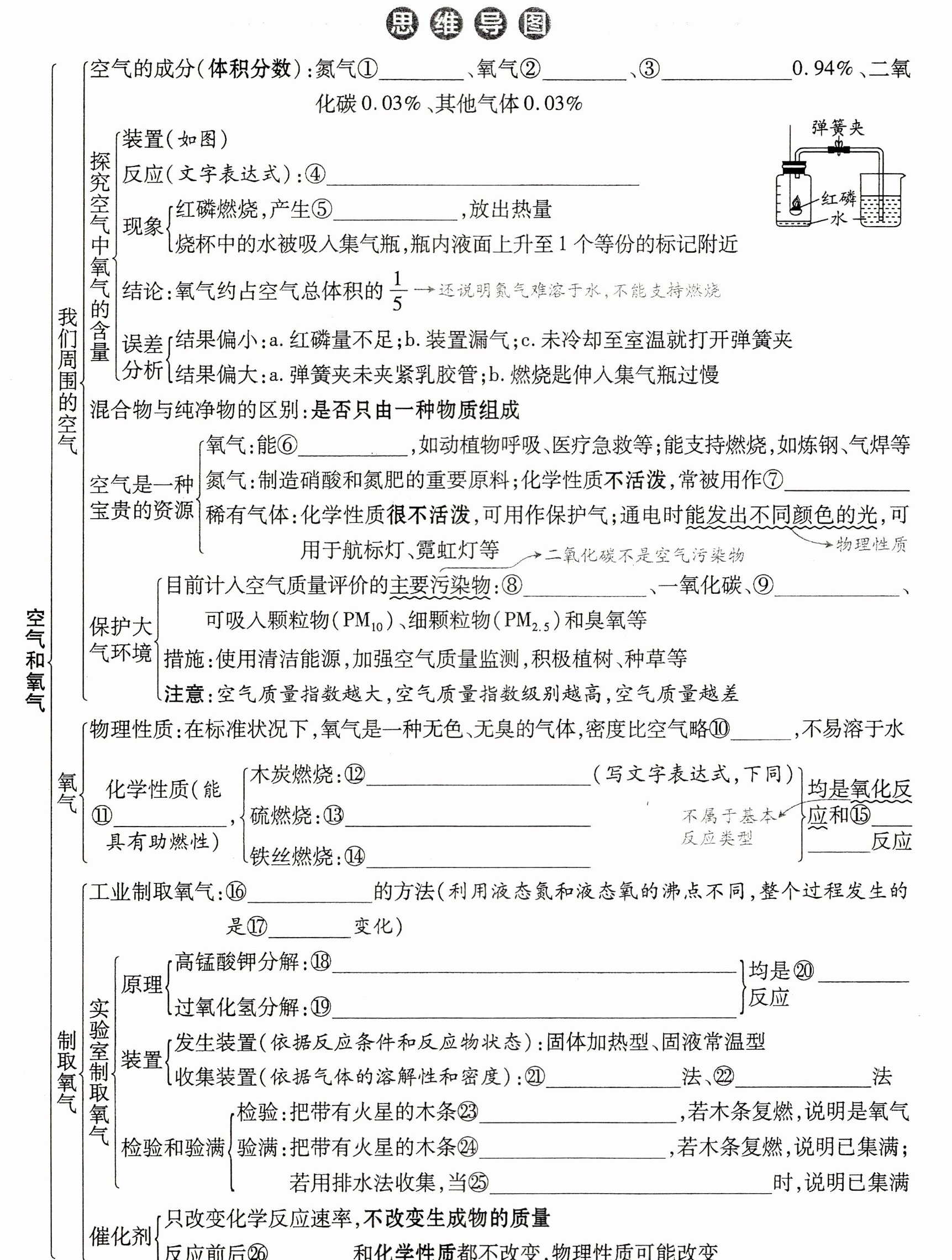 ①78% ②21% ③稀有气体 ④红磷+氧气$\xrightarrow{点燃}$五氧化二磷 ⑤大量白烟 ⑥供给呼吸 ⑦保护气 ⑧二氧化硫 ⑨二氧化氮 ⑩大 ⑪支持燃烧 ⑫碳+氧气$\xrightarrow{点燃}$二氧化碳 ⑬硫+氧气$\xrightarrow{点燃}$二氧化硫 ⑭铁+氧气$\xrightarrow{点燃}$四氧化三铁 ⑮化合 ⑯分离空气 ⑰物理 ⑱高锰酸钾$\xrightarrow{加热}$锰酸钾+二氧化锰+氧气 ⑲过氧化氢$\xrightarrow{二氧化锰}$水+氧气 ⑳分解 ㉑排水 ㉒向上排空气 ㉓插入集气瓶中 ㉔放在集气瓶口 ㉕集气瓶口有大气泡冒出 ㉖质量