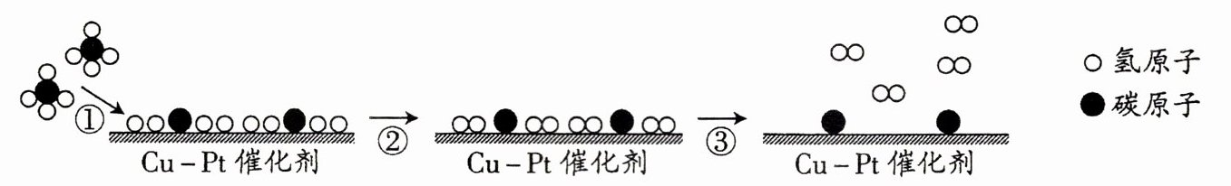 例3 高温时,甲烷(${CH4}$)在Cu-Pt催化剂表面分解生成氢气,同时碳原子沉积吸附在催化剂表面形成石墨烯,反应的微观示意图如图: