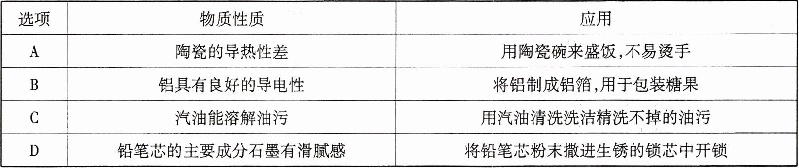 2. (2024成都中考改编)化学为航空航天领域的发展提供了强有力的支撑。下列材料用途利用的性质种类与其他三项不同的是 (