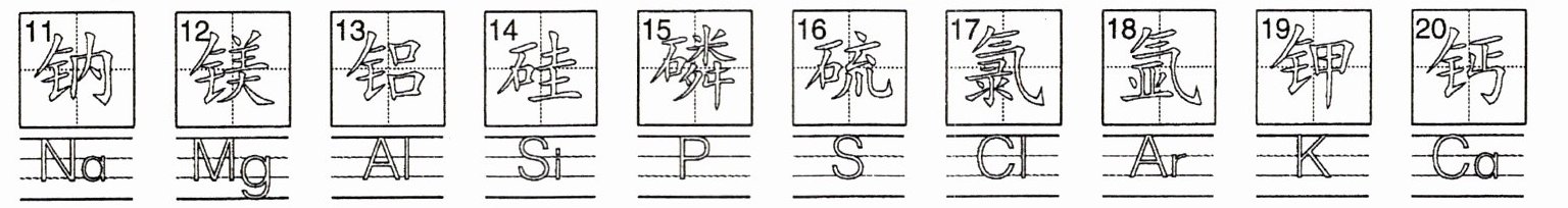 (临摹内容如题目所给插图1中的规范书写,此处省略图形,以文字说明:11钠Na、12镁Mg、13铝Al、14硅Si、15磷P、16硫S、17氯Cl、18氩Ar、19钾K、20钙Ca)