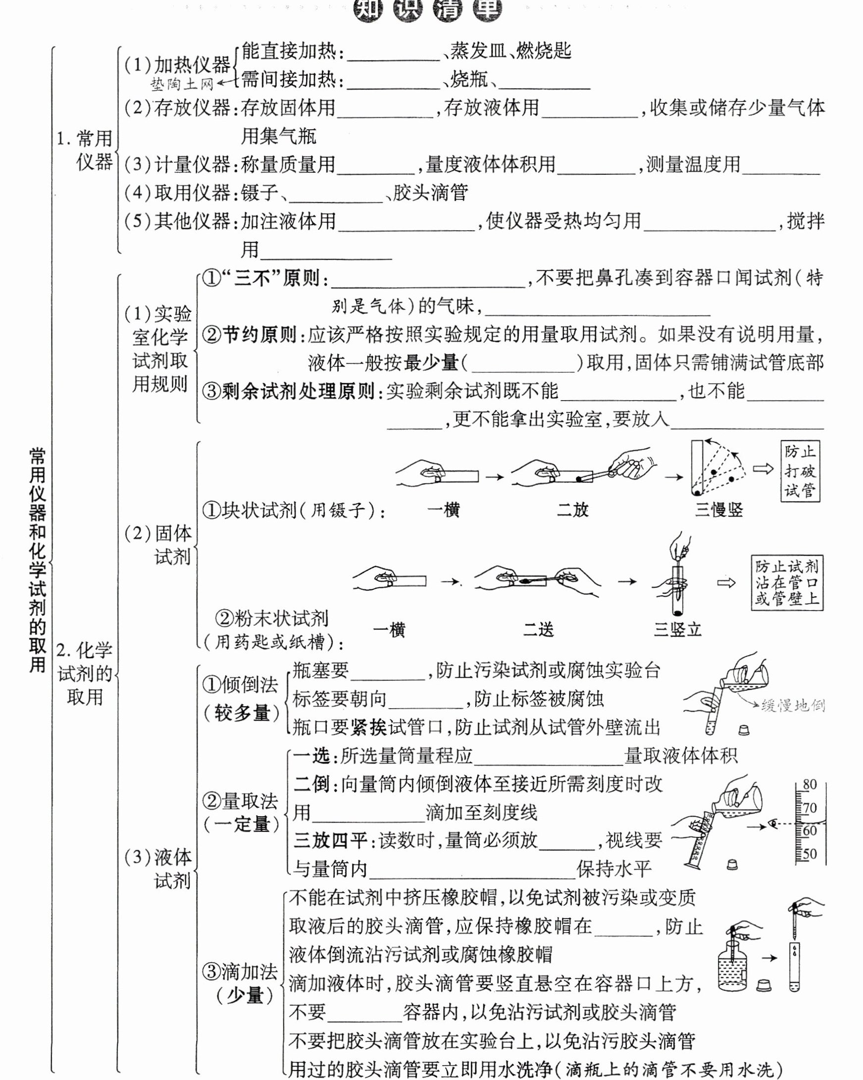 (1)①不能用手接触试剂 不得尝任何试剂的味道 ②1~2 mL ③放回原瓶 随意丢弃 指定的容器内