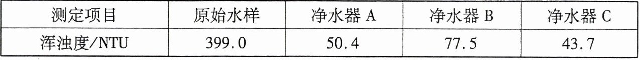 7. 同学们利用浊度传感器测试不同简易净水器的净水效果,得到如表数据:
