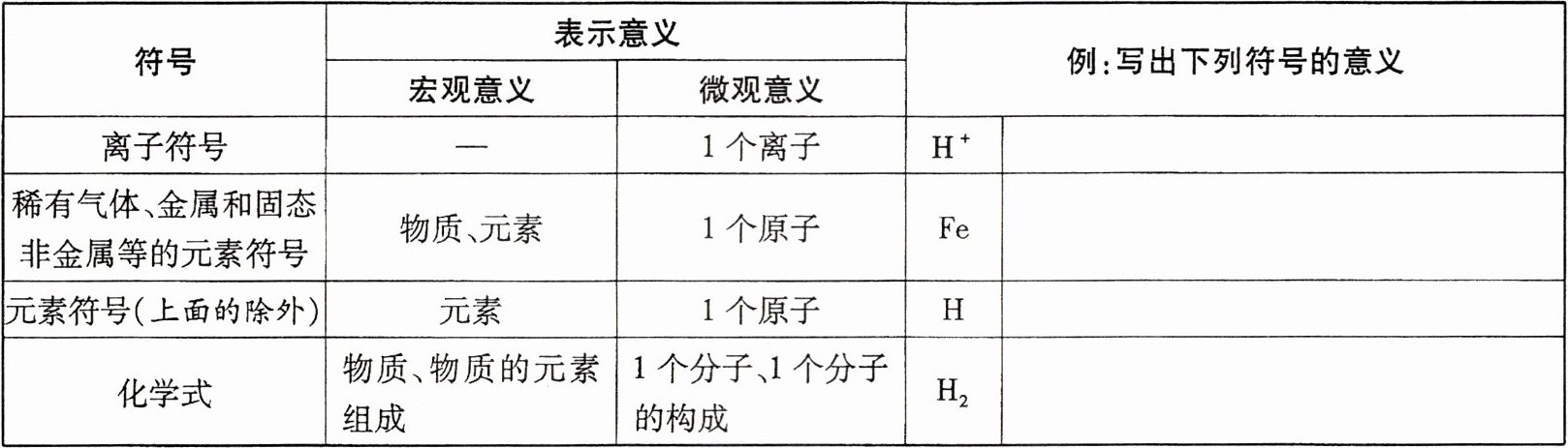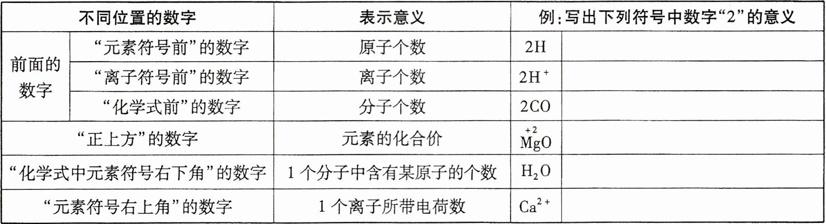 1.1个氢离子 铁、铁元素、1个铁原子 氢元素、1个氢原子 氢气、氢气由氢元素组成、1个氢分子、1个氢分子由2个氢原子构成 2.2个氢原子 2个氢离子 2个一氧化碳分子 氧化镁中镁元素的化合价为+2 1个水分子中含有2个氢原子 1个钙离子带2个单位正电荷