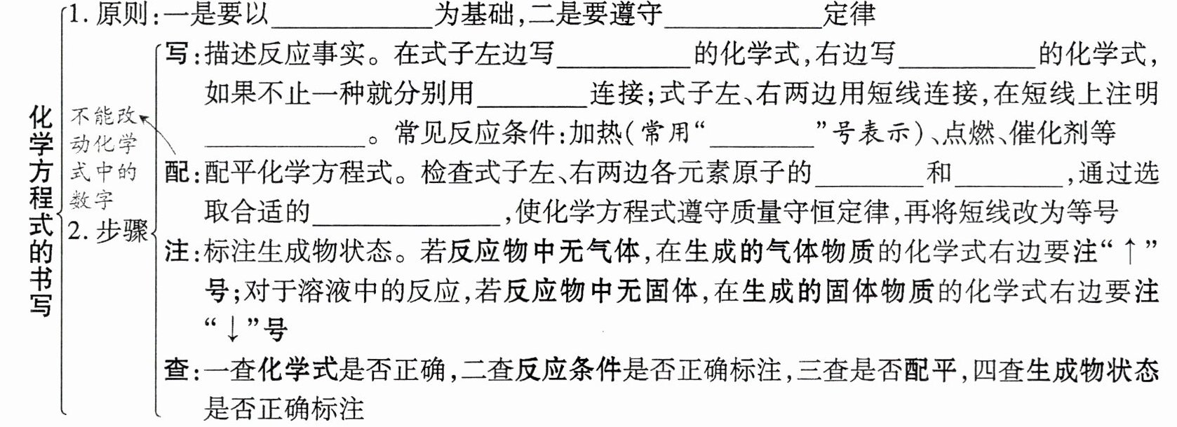 1. 客观事实 质量守恒 2. 反应物 生成物 加号 反应条件 △ 种类 数目 化学计量数