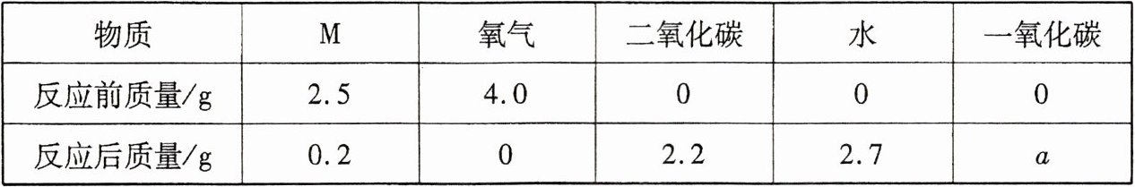 B 【解析】A.根据反应前后物质的总质量不变可知,$a=2.5+4.0-0.2-2.2-2.7=1.4$,正确;B.根据反应前后各元素的质量不变可知,参加反应的 M 中碳元素的质量$=2.2g×\frac {12}{44}+1.4g×\frac {12}{28}=1.2g$,氢元素的质量$=2.7g×\frac {2}{18}=0.3g$,氧元素的质量$=2.5g-0.2g-1.2g-0.3g=0.8g$,故 M 中一定会含有氧元素,错误;C.M 分子中碳、氢原子的个数比$=\frac {1.2g}{12}:\frac {0.3g}{1}=1:3$,正确;D.消耗氧气与生成二氧化碳的质量比$=4.0g:2.2g=20:11$,正确。故选 B。