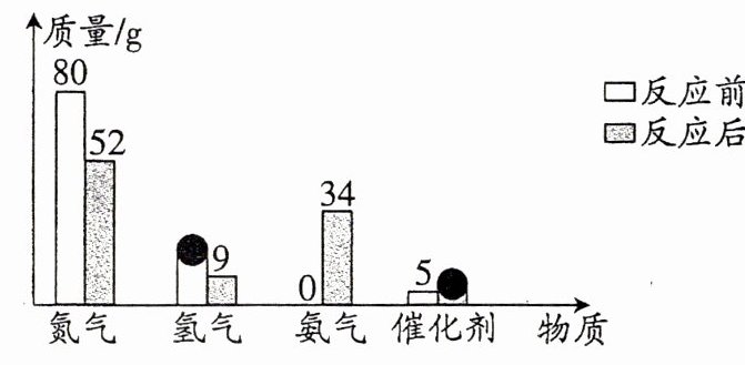 变式拓展 1.(2024河北中考)一定条件下,在密闭容器中加入氮气、氢气和催化剂合成氨气,反应前后各物质的质量如图,图中有两处被墨迹遮盖。下列说法正确的是 (