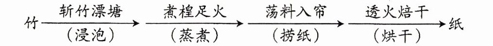 竹$\xrightarrow[(浸泡)]{斩竹漂塘}$ $\xrightarrow[(蒸煮)]{椎槽足火}$ $\xrightarrow[(捞纸)]{荡料入帘}$ $\xrightarrow[(烘干)]{透火焙干}$纸