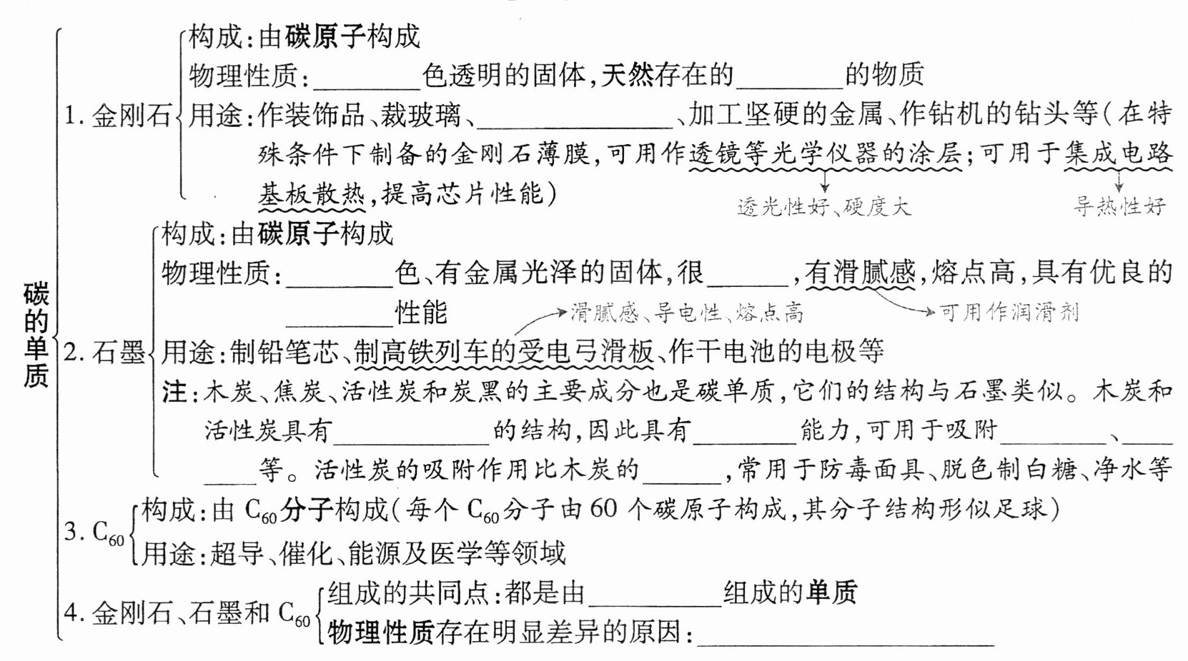 1. 无 最硬 切割大理石 2. 灰黑 软 导电 疏松多孔 吸附 色素 异味 强 4. 碳元素 碳原子排列方式不同