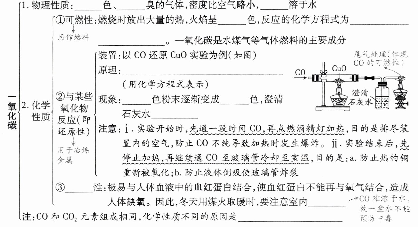 1.无 无 难 2.①蓝 2CO+O₂点燃2CO₂ ②CuO+CO△Cu+CO₂ 黑 红 变浑浊 ③毒 通风 注:分子构成不同