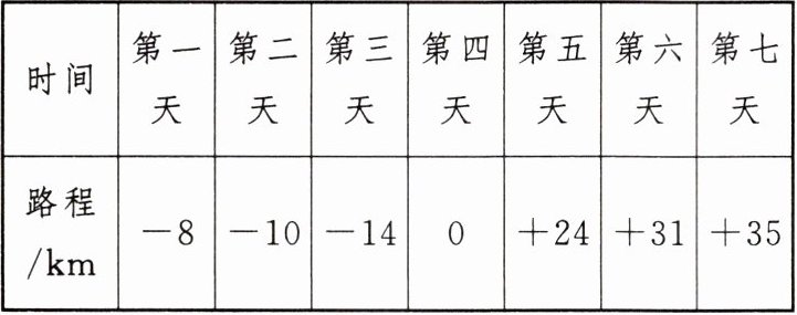 (2)$50×7+(-8-10-14+0+24+31+35)=350+58=408$(km),即小明家的新能源纯电动汽车这七天一共行驶了408 km.