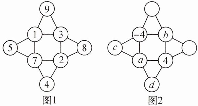 18. 新考向 数学文化“幻方”最早记载于春秋时期的《大戴礼记》中,如图1所示,每个三角形的三个顶点上的数字之和都与中间正方形四个顶点上的数字之和相等.现将$-4$,$-3$,$-2$,1,2,4,5,6填入如图2所示的“幻方”中,部分数据已填入,则$(d-c)^{a+b}$的值为