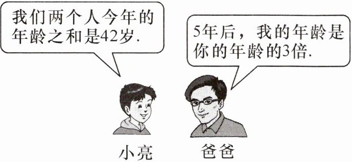 解:设小亮今年的年龄为x岁,则爸爸今年的年龄为(42-x)岁.根据题意,得$42-x+5=3(x+5)$,解得x=8.答:小亮今年的年龄为8岁.