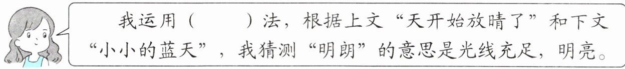 我运用( )法,根据上文“天开始放晴了”和下文“小小的蓝天”,我猜测“明朗”的意思是光线充足,明亮。