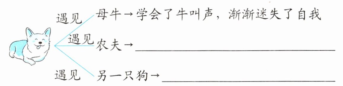 示例:每天看守农场,失去了自由 找对了老师,学会真正的狗叫 解析:本题考查预测。根据题干的要求以及课文的内容写出猜测的结局。只要猜测合理即可。