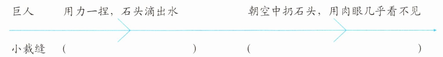 小裁缝解开上衣,露出腰带来给巨人看:“你念一念就知道我是何等人啦。”巨人念道:“一下子打死七个。”心想这位裁缝一下子打死的是七个人,不禁对小裁缝产生几分敬意。不过,他决心要先试试小裁缝,就拣起一块石头来,用手使劲一捏,捏得石头滴出了水。“要是你真有力气,”巨人说,“也来这么一手吧。”