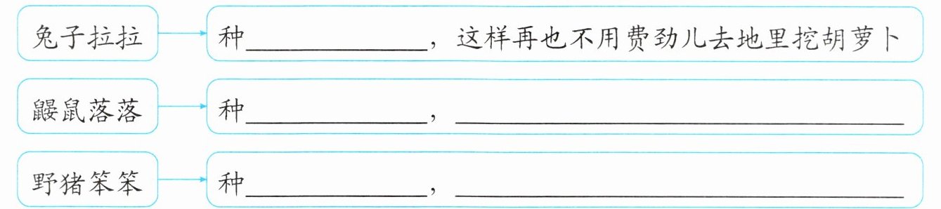 ②大家苦思冥想的时候,兔子拉拉跳出来说:“我想种一棵比梯子高半头、比木桶还要粗一圈的胡萝卜树,上面长满大大的胡萝卜。那样,我再也不用费劲儿去地里挖胡萝卜了。”