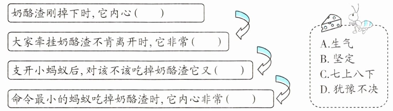 三 联系课文内容,蚂蚁队长的心理经历了怎样的变化?选一选,填一填。
